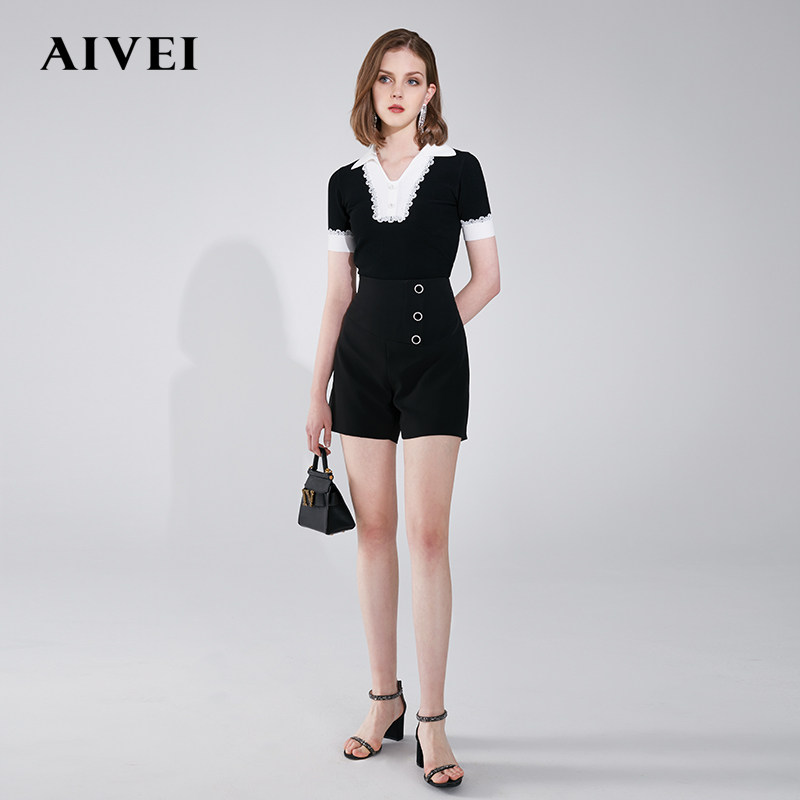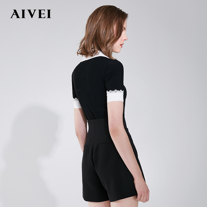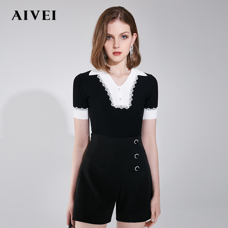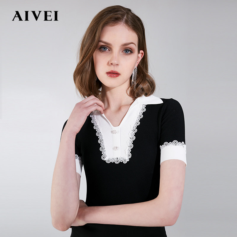 AIVEI Xinhe Ivy 2021 early autumn new lace stitching slim short sleeve wool sweater N0160026
