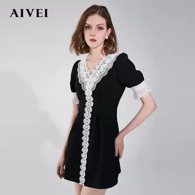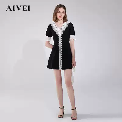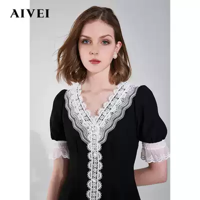 AIVEI Xinhe iwei 2021 summer new bubble sleeve waist lace stitching V-neck dress N0160029