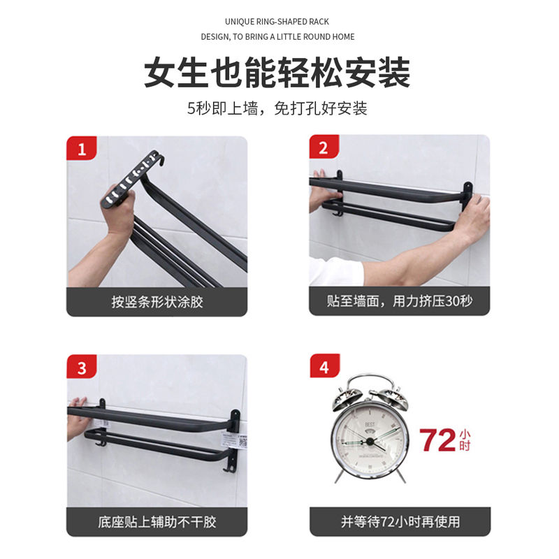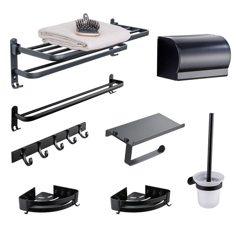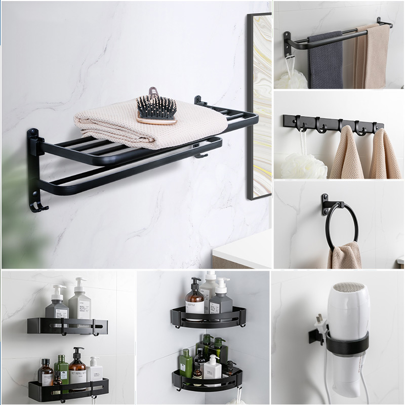 Space aluminum folding black towel rack double-layer triangle basket double-layer square basket triangle double-layer shelf square double-layer shelf towel rack towel ring hook black three-piece set A