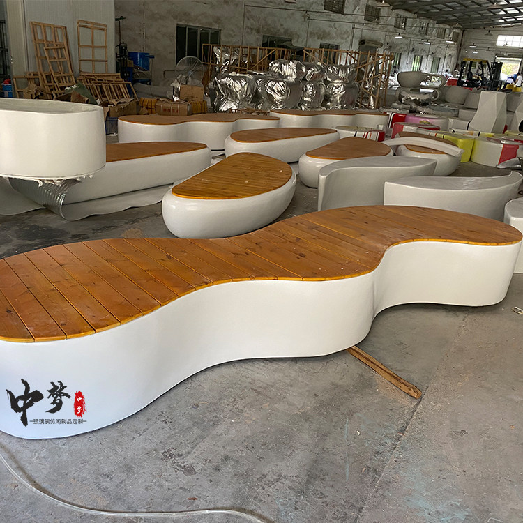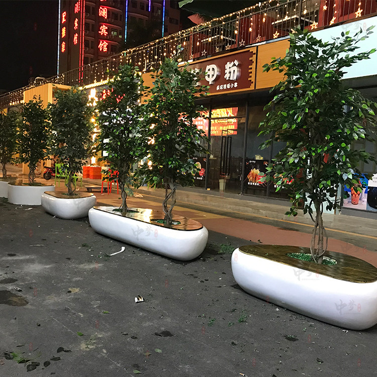 Large shopping mall promenade combination special-shaped leisure chair fashion with wooden sitting surface green plant flower trough custom outdoor bench