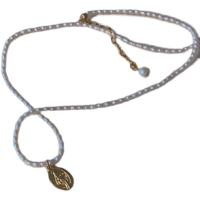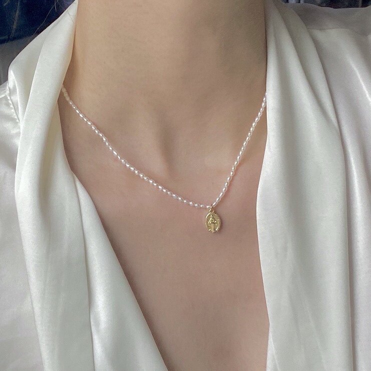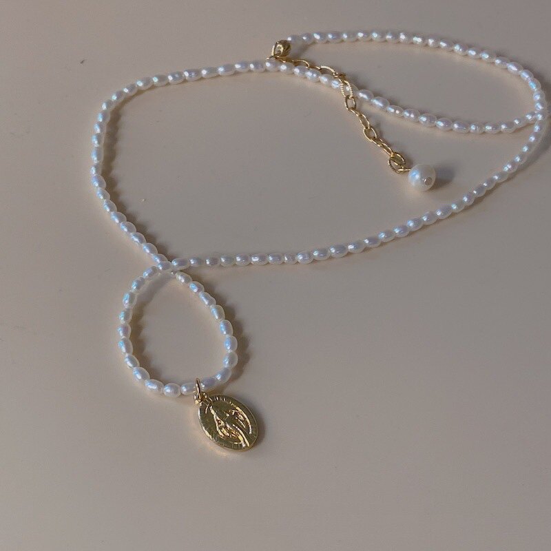 ins wind light extravagant temperament USA 14K bag gold freshwater pearl round plate pendant necklace lock bone chain brief and delicate woman