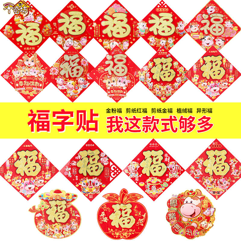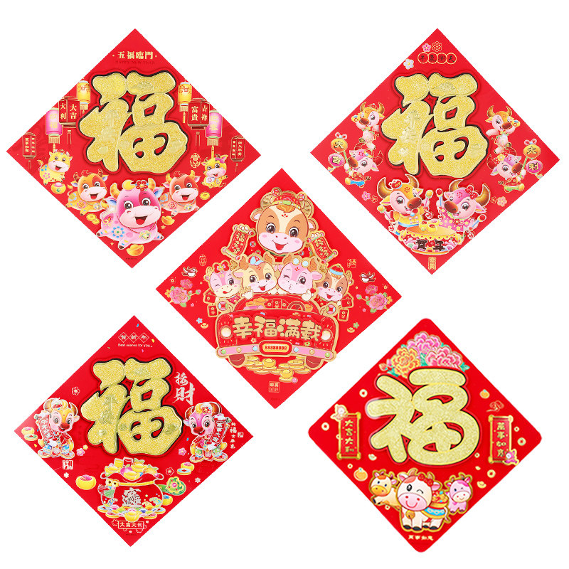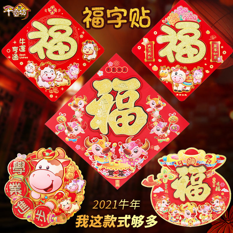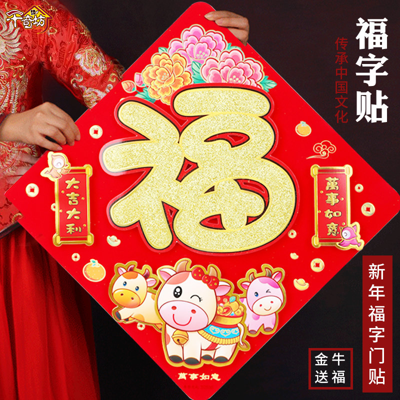 Fu zi door sticker Fu zi sticker 2021 ox year new year decoration Spring Festival door panel god of wealth grandpa cartoon door god year painting fu character