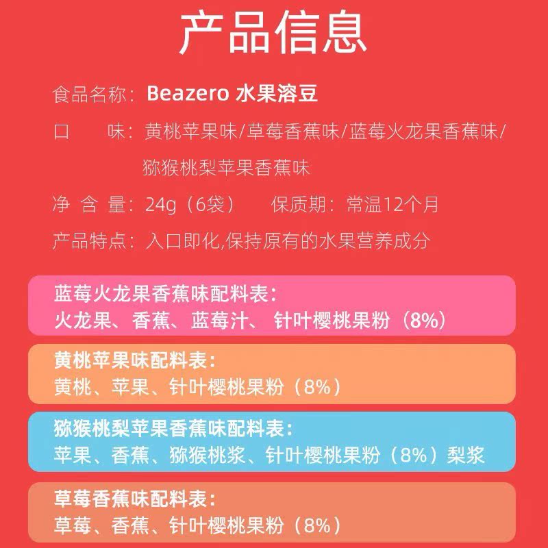 Fruit Melting Beans (1 box of 4 flavors each 24g*4) Vegetable Melting Beans (1 box of 4 flavors 24g*4) Yogurt Melting Beans (1 box of 4 flavors 20g*4) Three boxes of puff sticks (