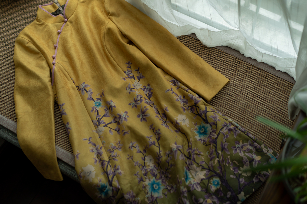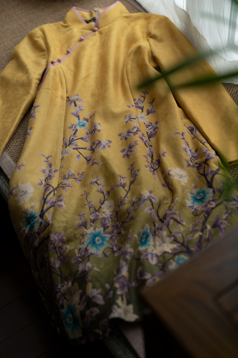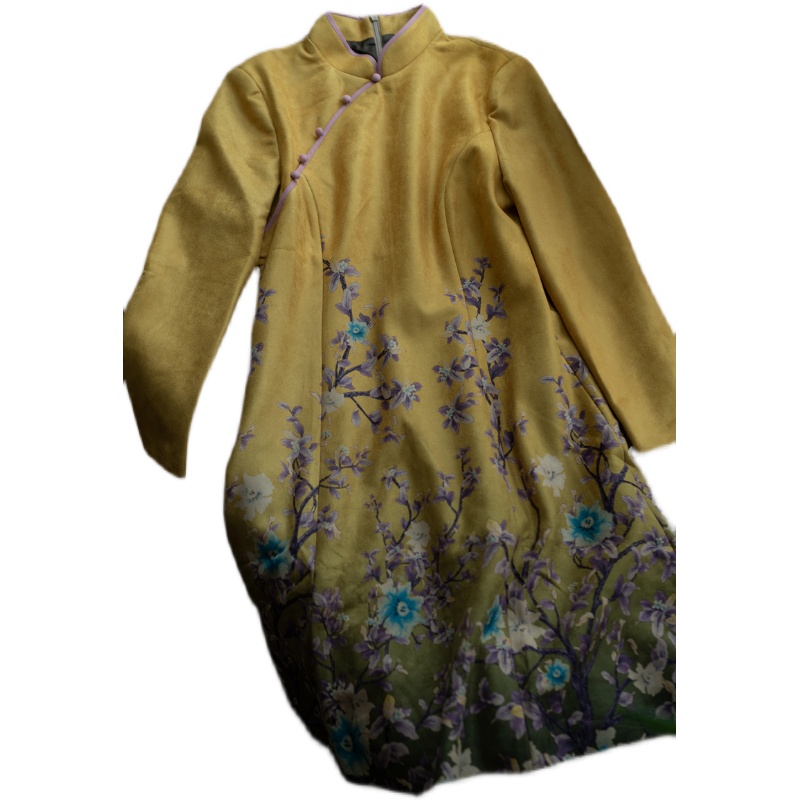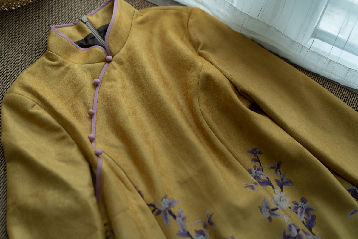 (Spot) improved Chinese style) ginger yellow suede improved cheongsam dress spring, autumn and winter