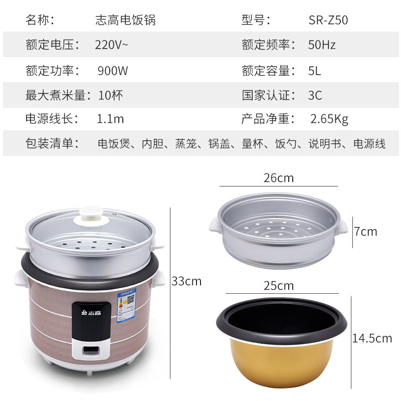 Zhigao rice cooker 5 liters household electric pot Old-fashioned large mini rice cooker steamer glass transparent lid steaming