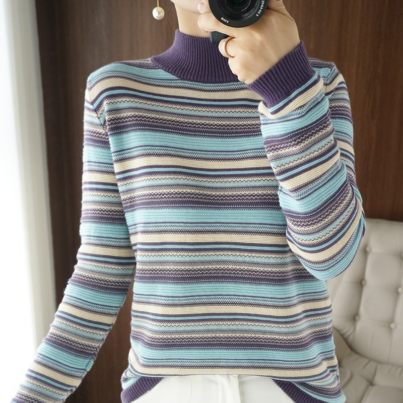 100% cotton line striped knitted sweater women's pullover cotton and linen thick sweater color striped long-sleeved warm bottoming top