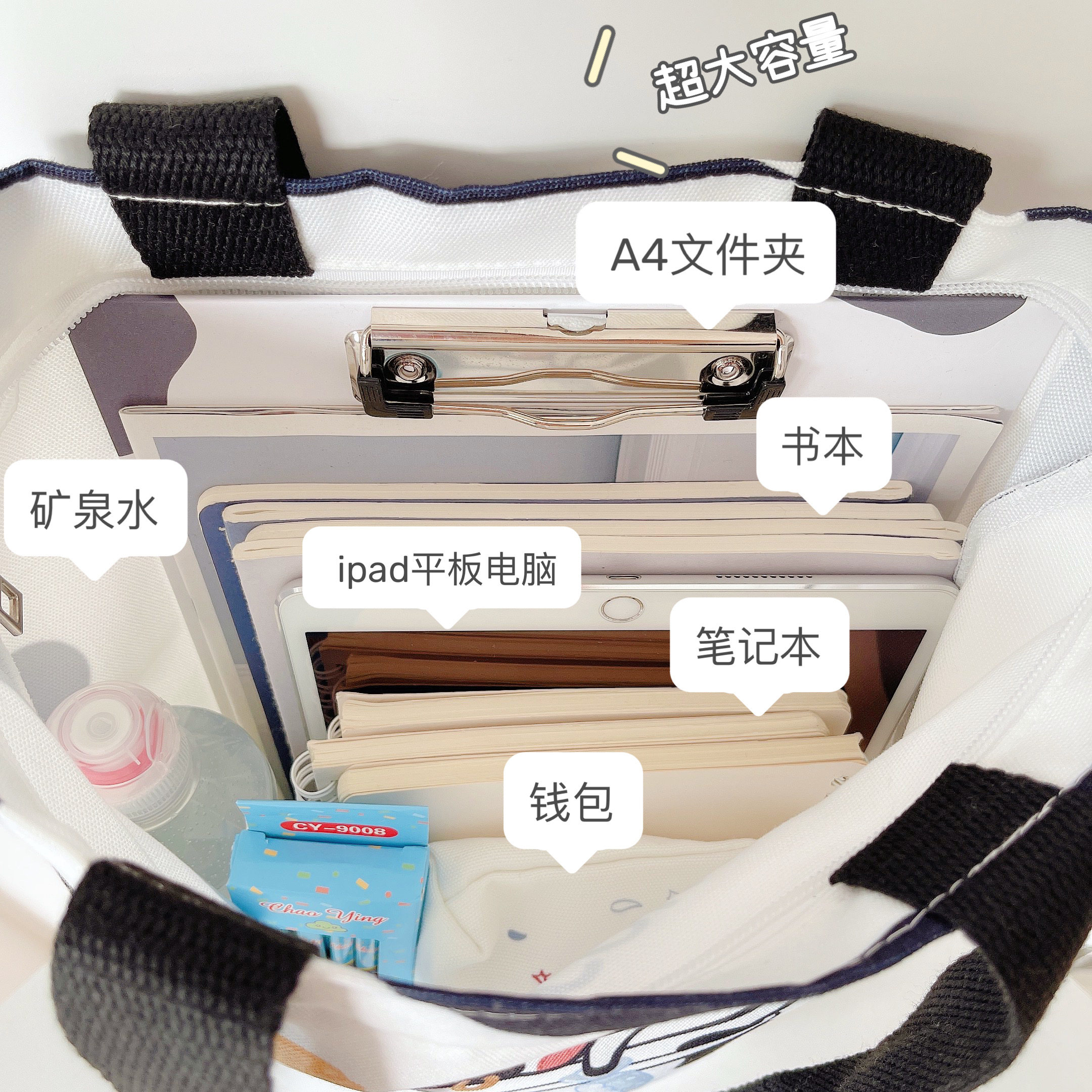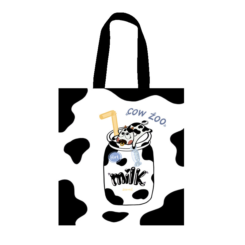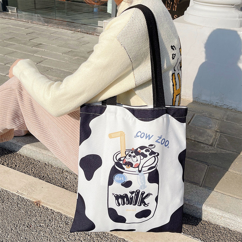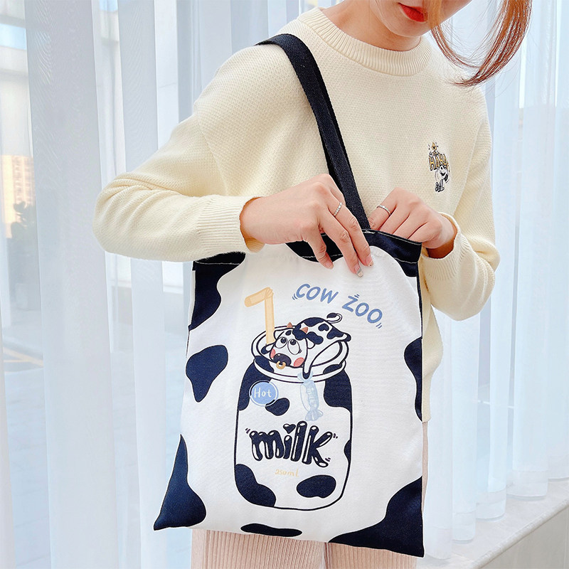 Cow Japanese one-shoulder canvas bag ins large-capacity student cute zipper cloth bag female bag cartoon tote bag - Taobao