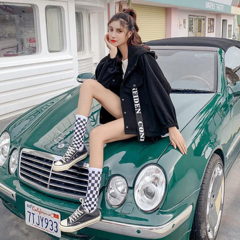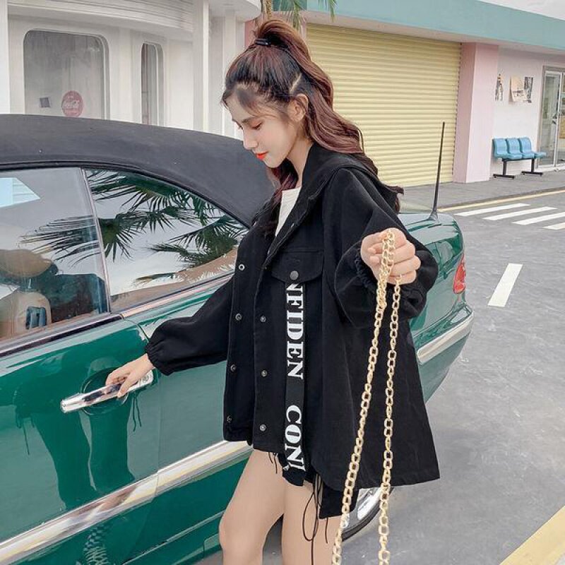 Cowboy coat female student Korean version of loose hooded spring and autumn short clown printed fat MM large size denim coat