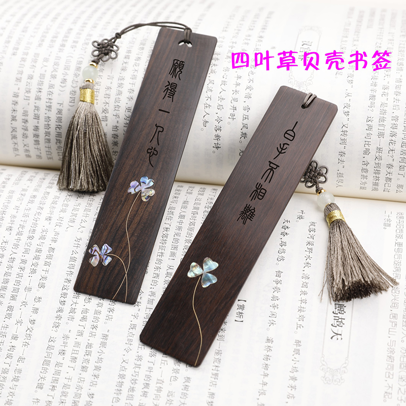 Retro China Wind Black Sandalwood Streaming Su Bookmarking Suit Upscale Fine Seashells Four Leaf Grass Art Solid Wood Bookmarking Embed Lucky Grass Custom Lettering Souvenir Student Teachers' Festival Gift Giving Teacher