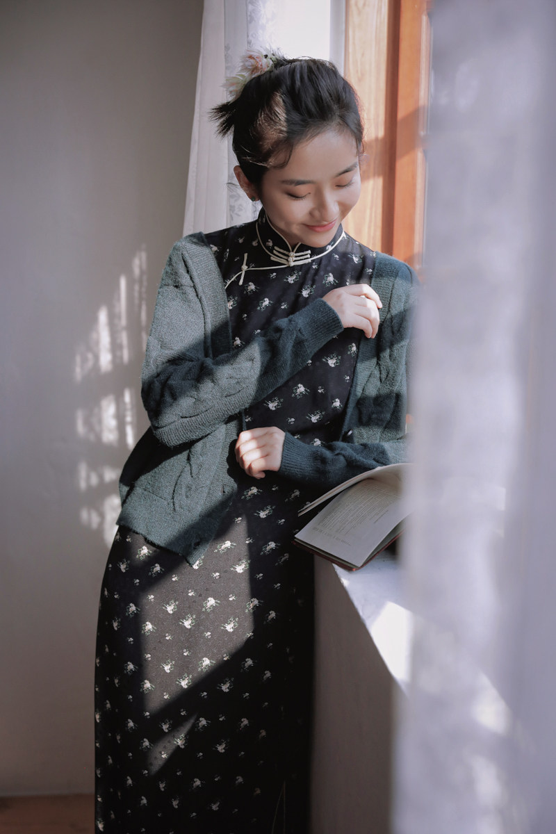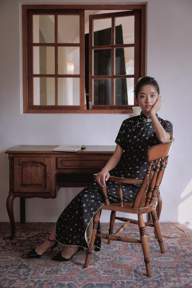 Jasmine spring and summer three-point sleeves full cardigan long section retro daily jacquard silk cheongsam with dark fragrance