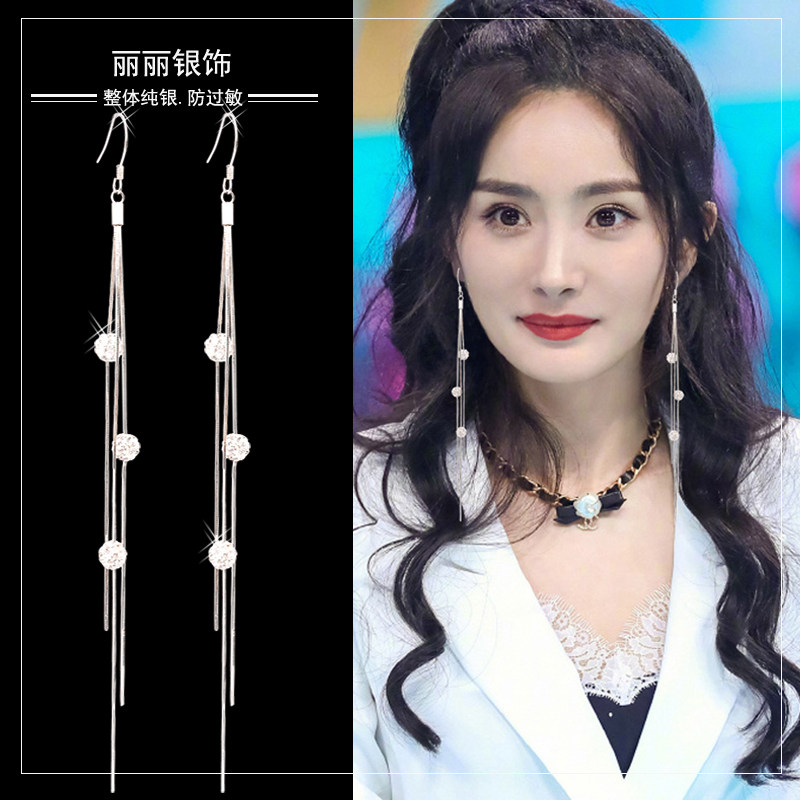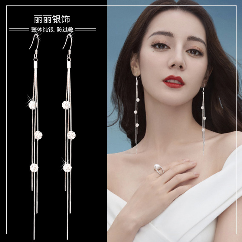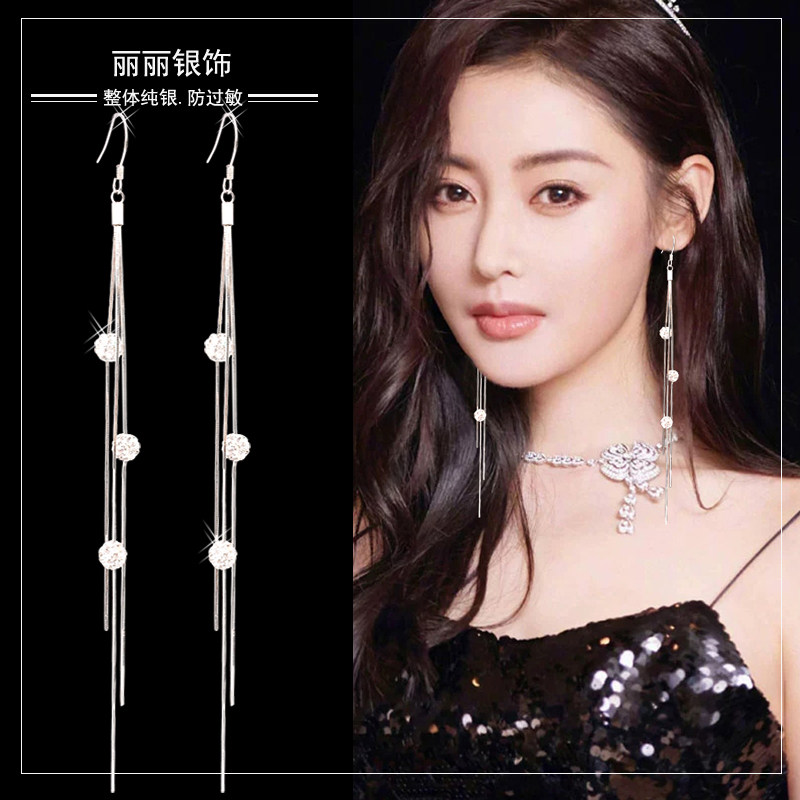 Advanced Sensation Flow Suearrings S925 Pure Silver Anti-Allergy Korea Temperament Shiny Drill Ball Net Red Long earline headwear-Taobao