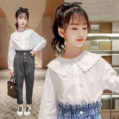 White one-piece shirt Blue high-waisted bud pants Dark gray high-waisted bud pants