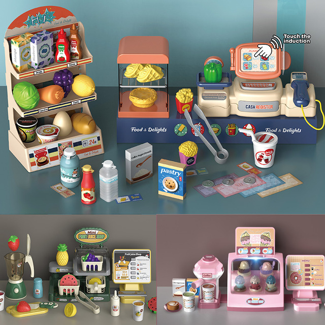 2281-35PCS burger cashier (water outlet open window box 2282-28PCS juice cashier silver (add water open window box 2283-35PCS pizza cashier (water outlet open window box)