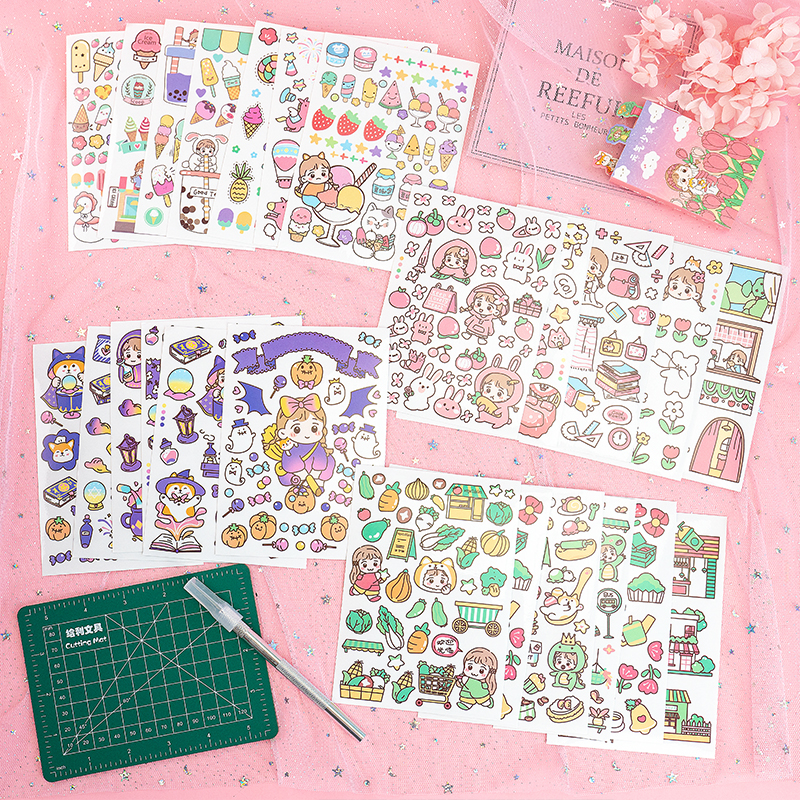 Mai and Chestnut Jun Handbook Sticker Set A cute cartoon girl ins wind character net red handbook girl heart decoration sticker small pattern diy material with engraved knife pad board tool full set
