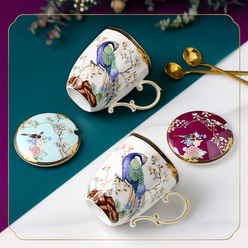 Chinese-style bird facing phoenix large-capacity ceramic water cup creative trend mug with lid spoon household scented tea cup