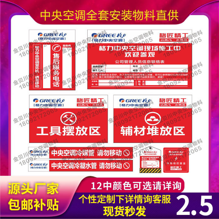 1.5P(2.2-3.6)Inner machine dust cover 2P(4.0-6.3)Inner machine dust cover 3P(7.1)Inner machine dust cover Water pipe sticker (300*54)100 pieces Refrigerant pipe sticker (300*54)100 pieces of water pipe sticker (500*54)100 pieces of refrigerant pipe sticker (500* 54) 100 construction specifications 5 auxiliary material stacking place paste 10 tool placement sticker 10 door sticker 10 outdoor machine sticker 10 material tools floor mat equipment storage floor pad wire controller cover 10 test pressure cards 10 custom special shots