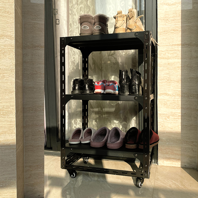 Convenient multi-functional assembly push-pull black storage home with rollers mobile angle steel lifting storage shoe rack