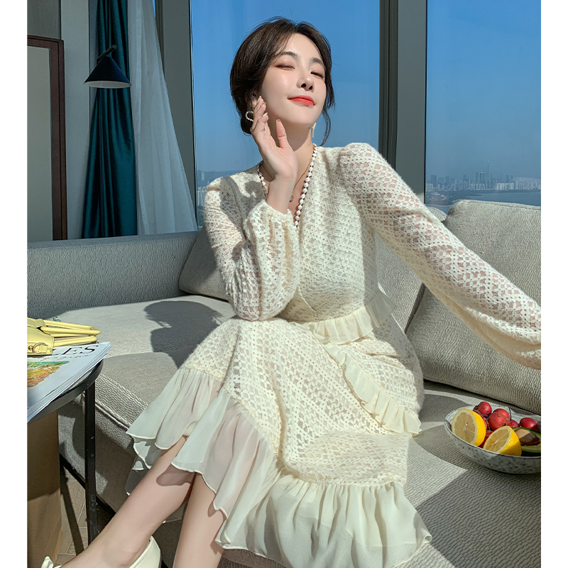 2022 Spring Autumn New Women's Dress Gentle Wind High-end Brother-in-law Design Sensation V Lead Lace Hollowed-out and Thin Ocean Dress Woman