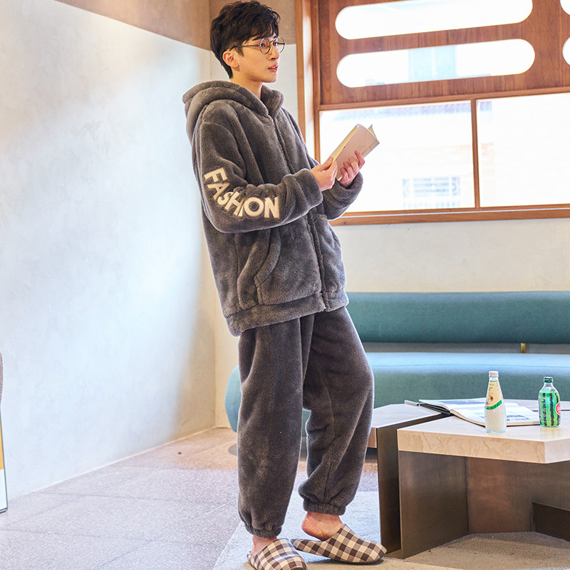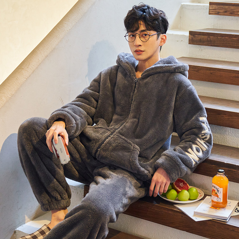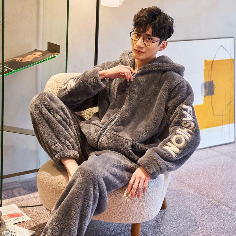 Coral Suede Autumn Winter Men's Sleeping Clothes Thicken Plus Suede Cap Pull Chain Brief Warm Flannel Suede Suit Suit