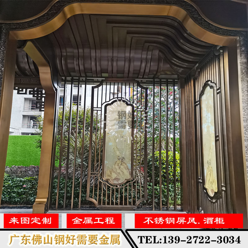 Sample House Display Center Stainless Steel Screen Hallway Aisle Reception Hall Wire Drawing Rose Gold Glass Metal Partition Chinese Xuanguan
