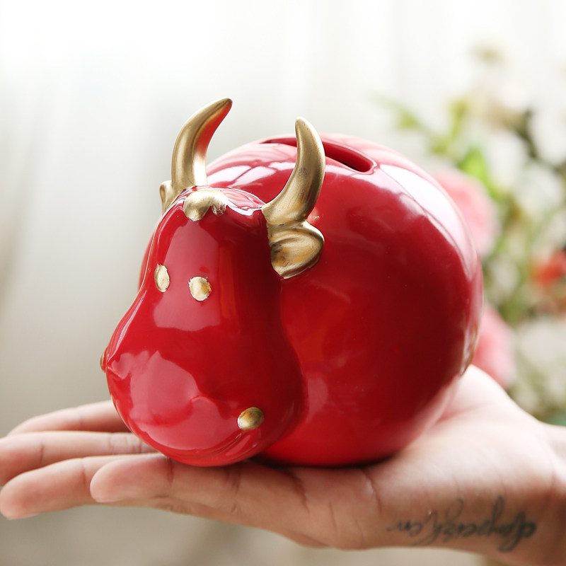 2022 New Ceramic Piggy Bank Lucky Cow Ornament Bullish Big Red Piggy Bank Creative Gift Customization
