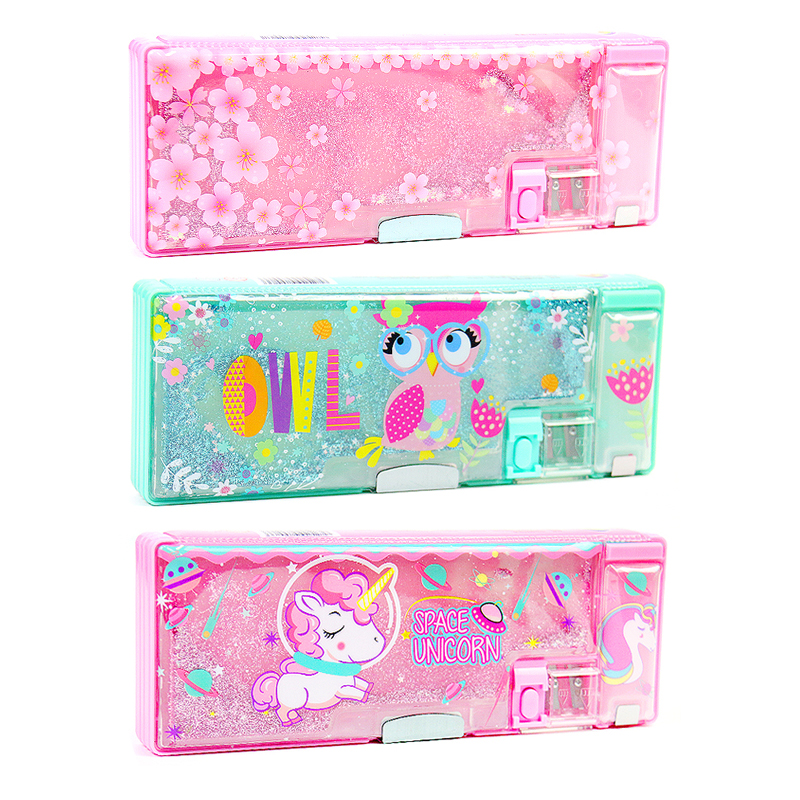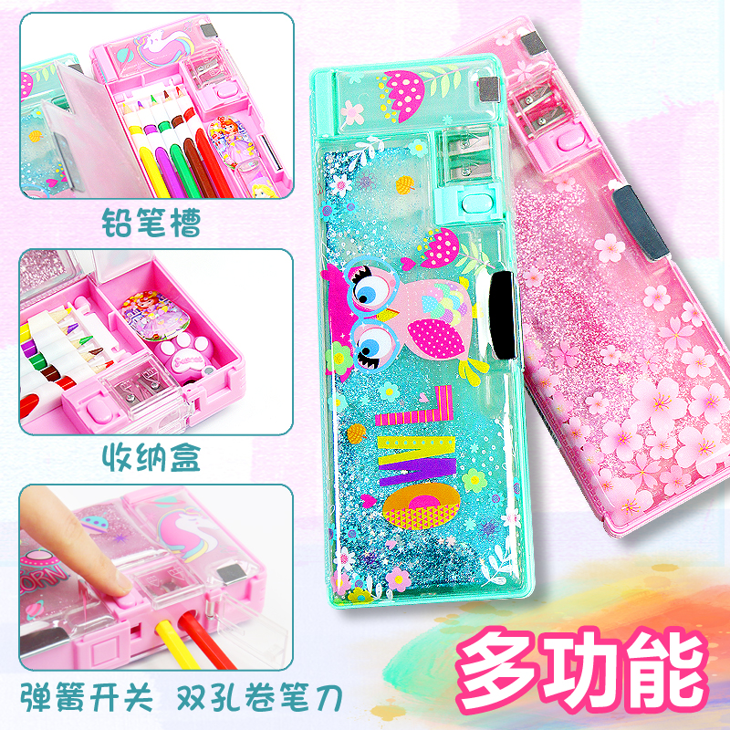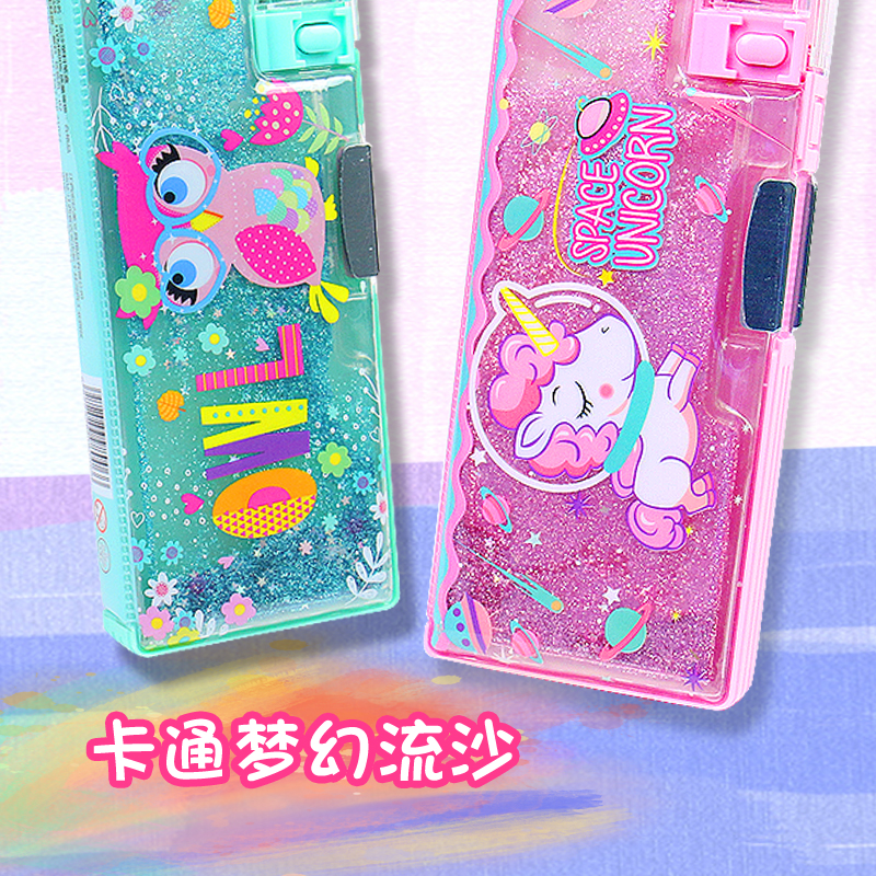 Net red quicksand stationery box unicorn cherry blossom liquid first grade elementary school student boy girl multi-function kindergarten children creative plastic pencil box cartoon toy box ins cute large capacity