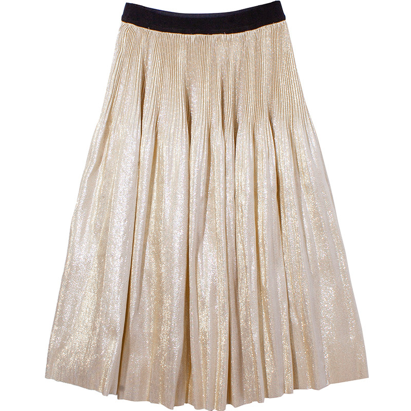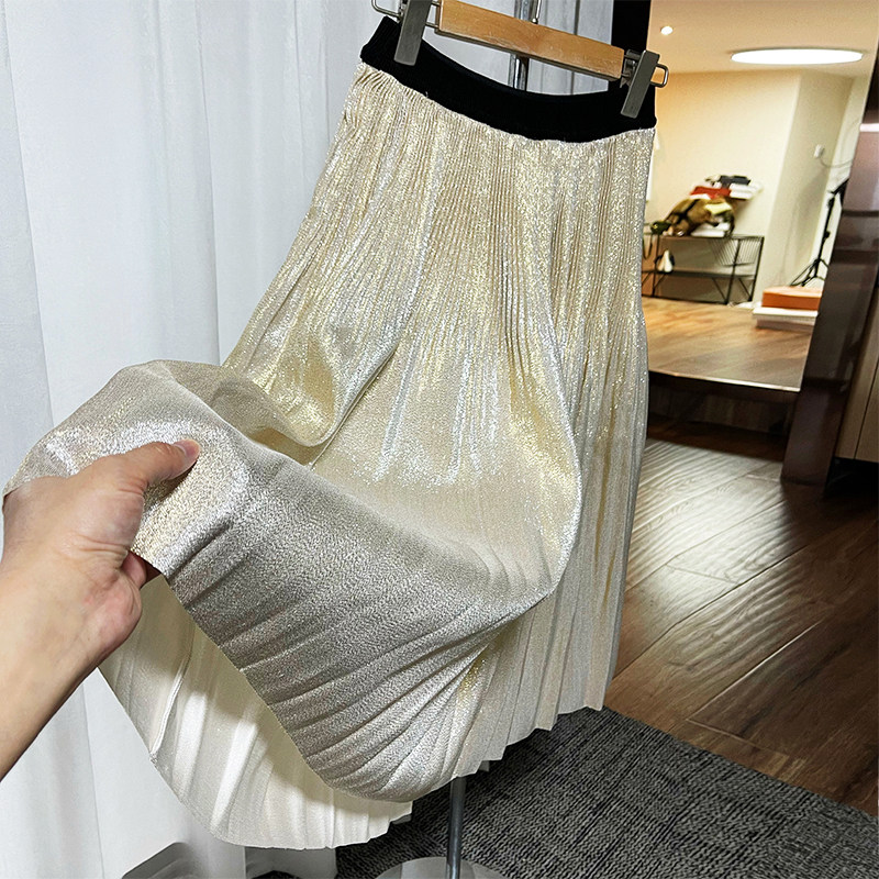 Small number of few pieces of gorgeous shiny layer 100 pleats tightness waist fluffy A word over the knee long version half body dress champagne x