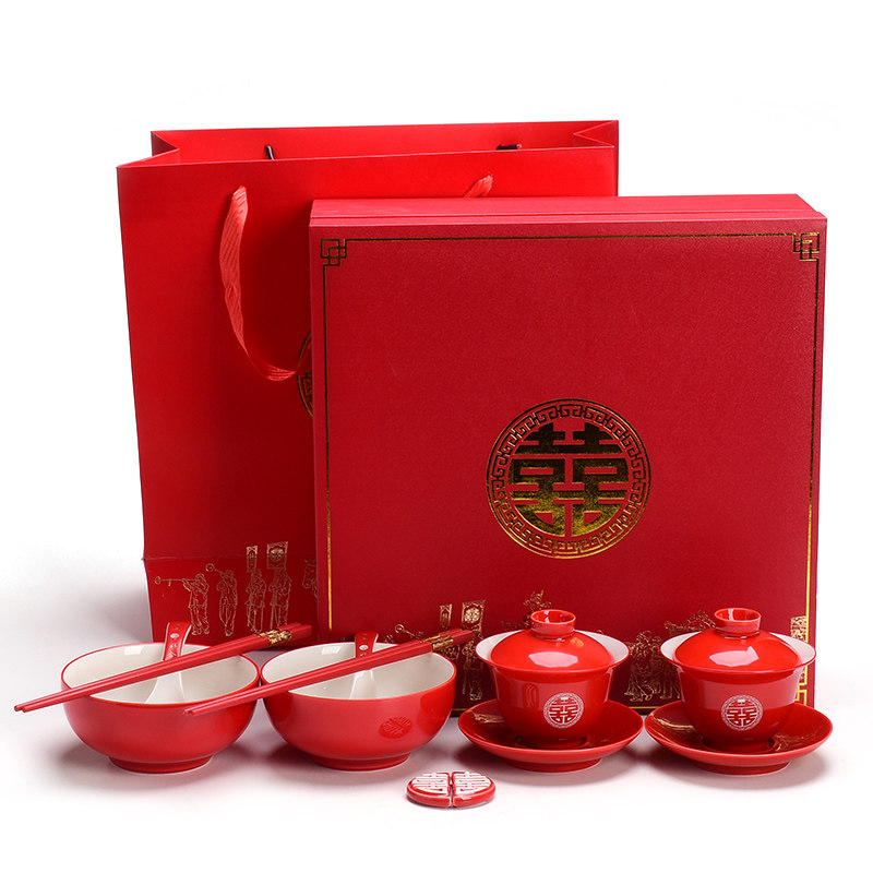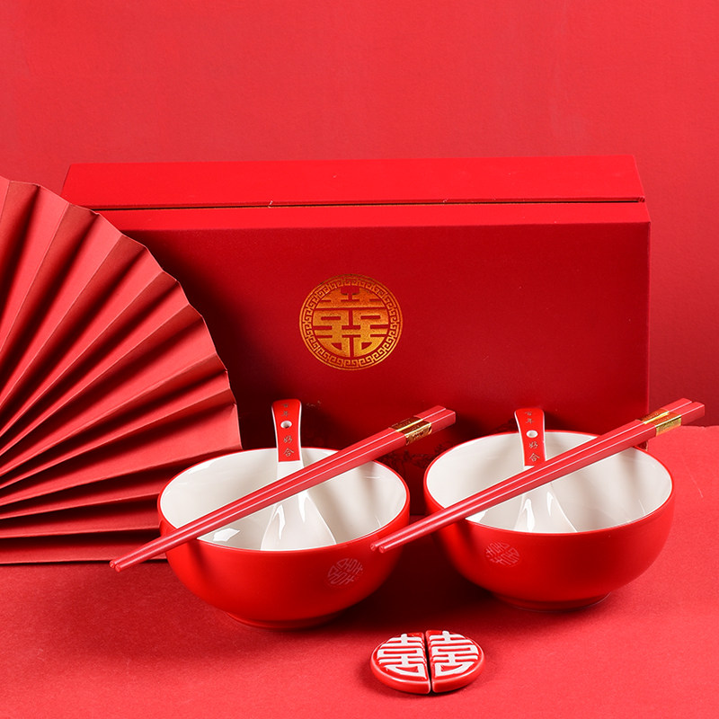 Wedding bowl chopsticks couple table chopsticks a pair of ceramic toast tea cup set red wedding supplies pair bowl wedding gift