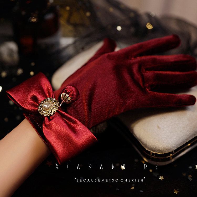 Senior Goddess Lady Wine Red Satin Thick Autumn and Winter Gloves Bridal Toast Clothing Annual Meeting Event Modeling Accessories