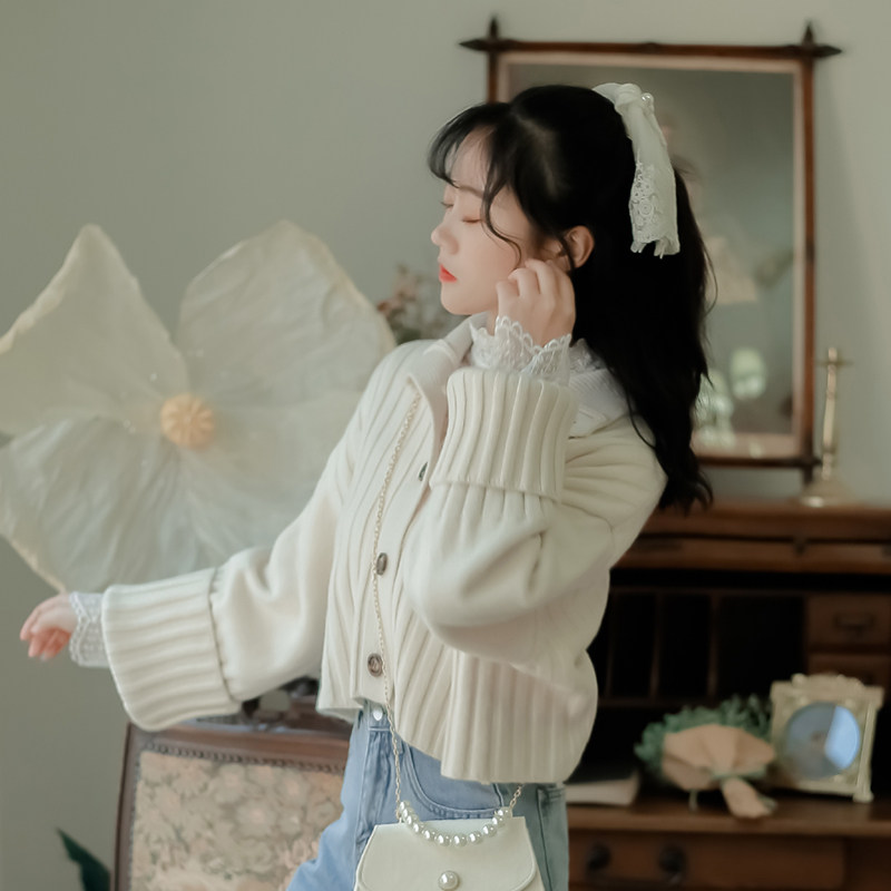 White knit cardiovert jacket 2021 Spring loaded with new women's sweater loot outside wearing a lazy windfall short jacket