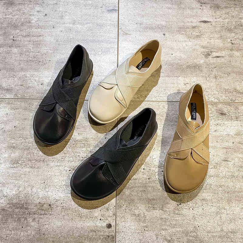 Round head softbottom women 2021 spring new soft leather casual students cross elastic band deep flat bottom