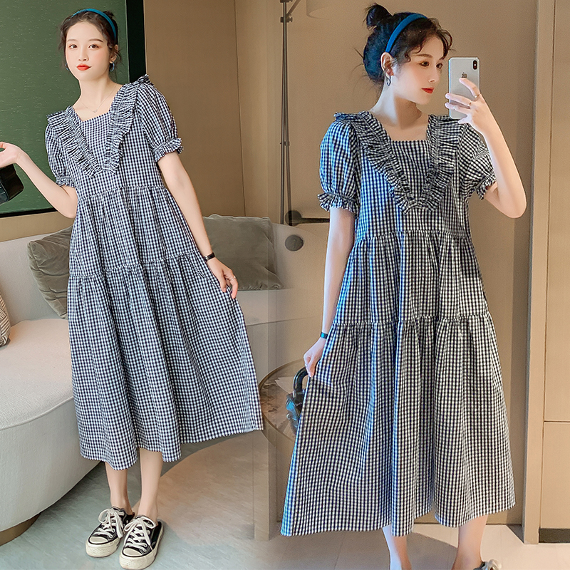 Pregnancy Woman dress with summer dress Dress Temperament Long Version Plaid Skirt Net Red summer V Spicy Mother Short Sleeve Long Ocean Dress Summer Women