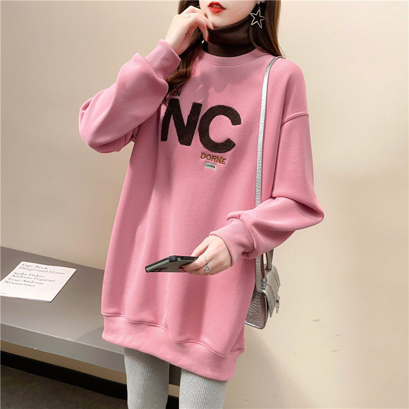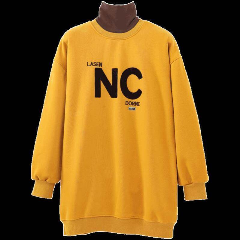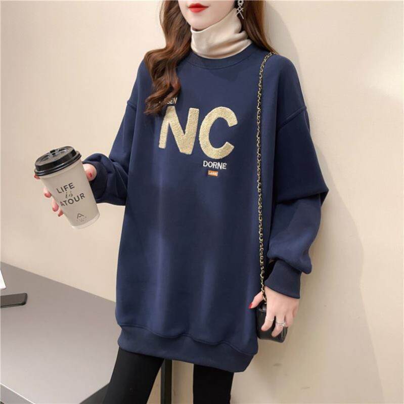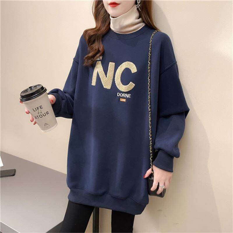 (Antarctic people)Fashion women's medium and long version of fake two-piece velvet thick cotton T stitching printed letters Jane flame