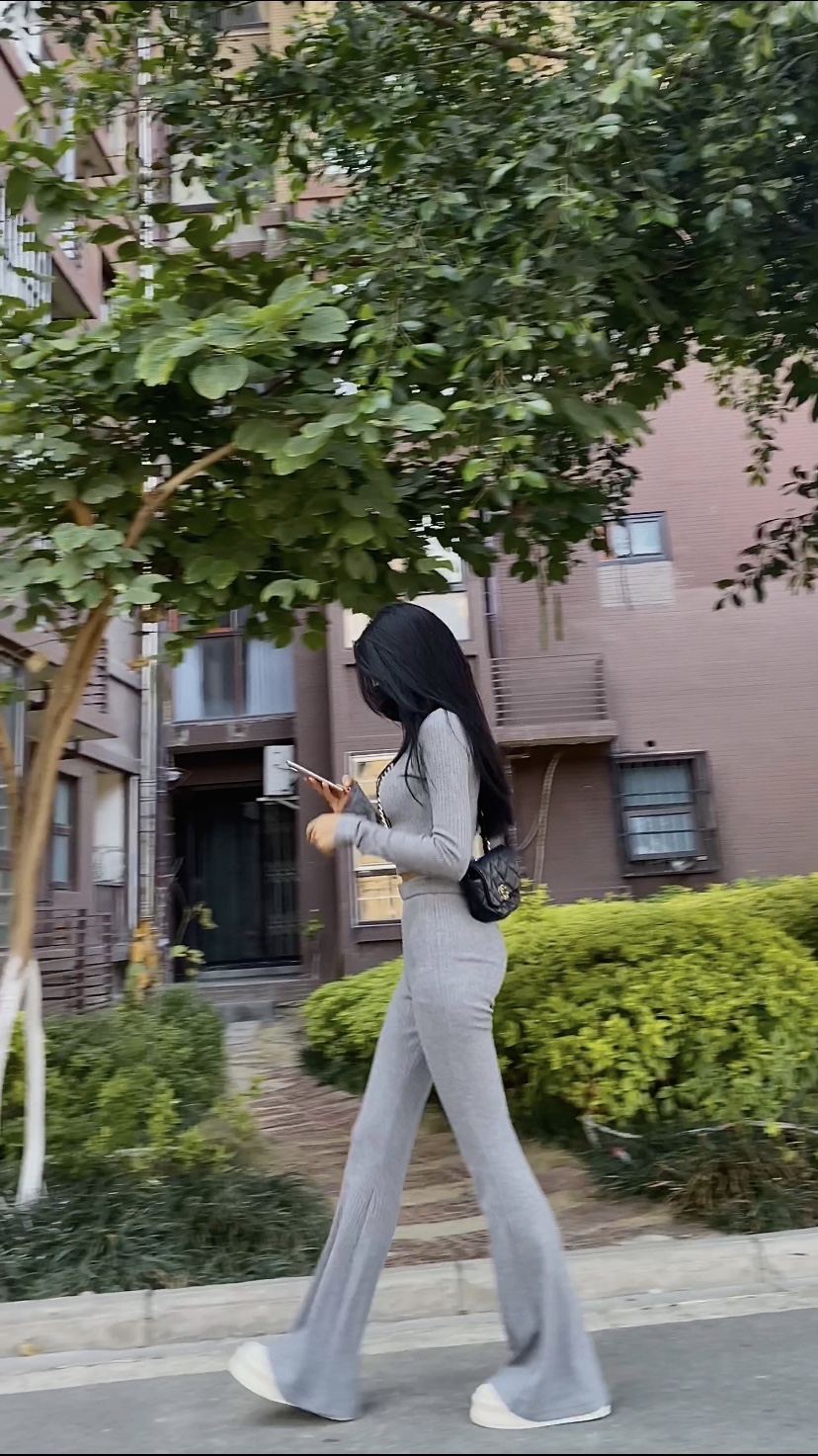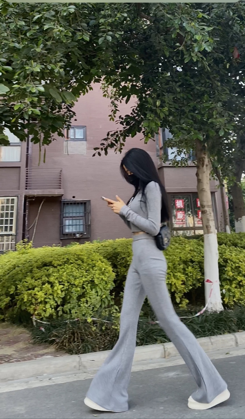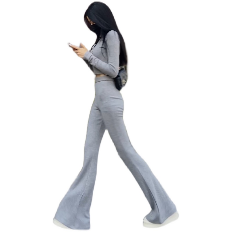 enen fashion suit female Korean solid color round neck short top high waist slim flared pants casual two piece