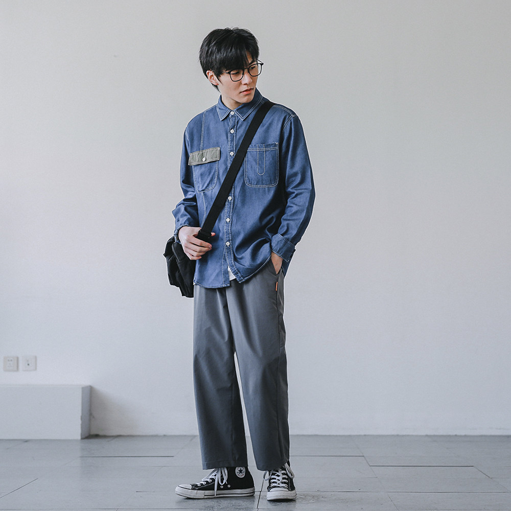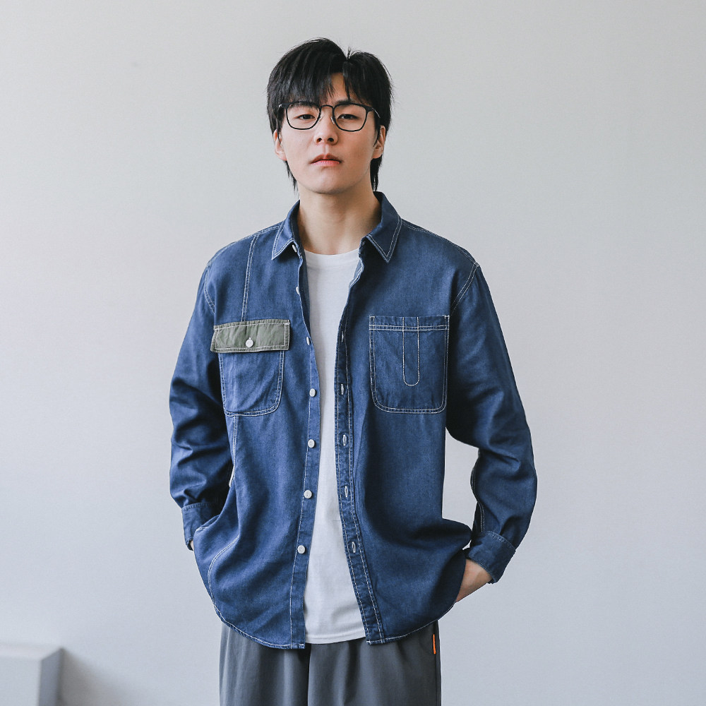(Broken code clearance) lapel pocket stitching denim shirt