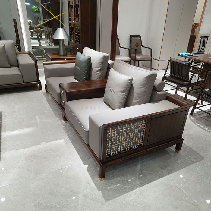 New Chinese style ebony wood office sofa villa model room living room light luxury carved large apartment leather art sofa atmosphere