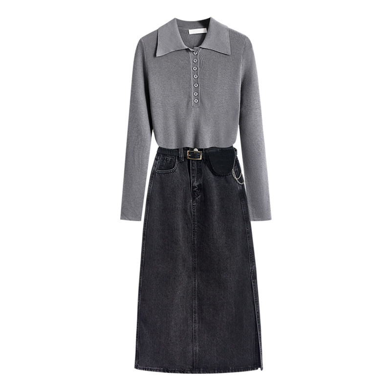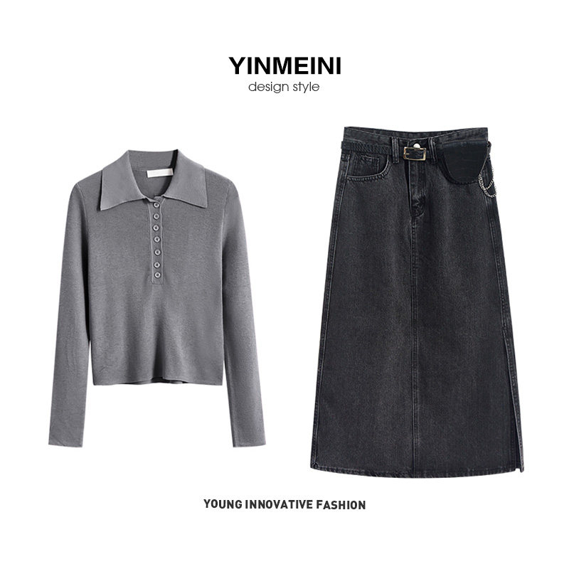Sweater knit set spring 2021 New fried street temperament goddess Fan fashion denim skirt two-piece set