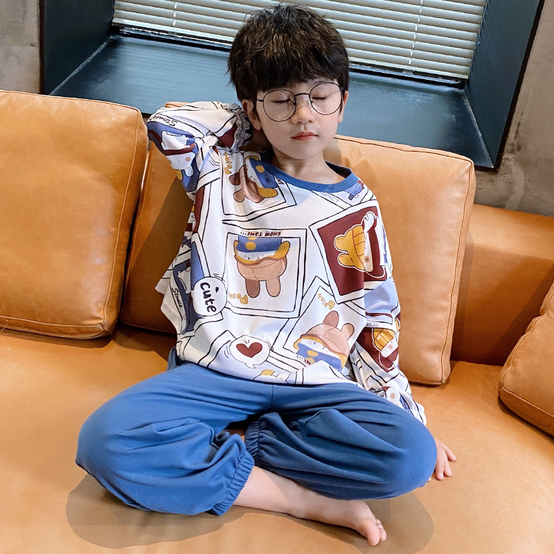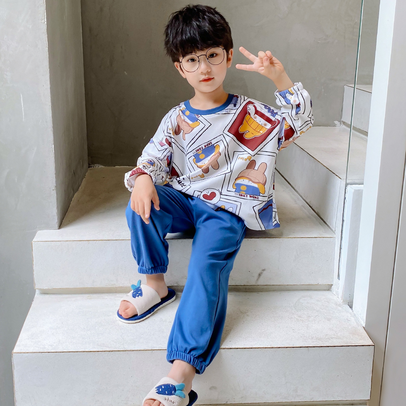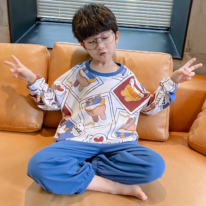 Male Treasure Spring Autumn Pure Cotton Children Sleeping Clothes Cute Cartoon Boy Big Boy Long Sleeve Round Collar Home Suit Suit
