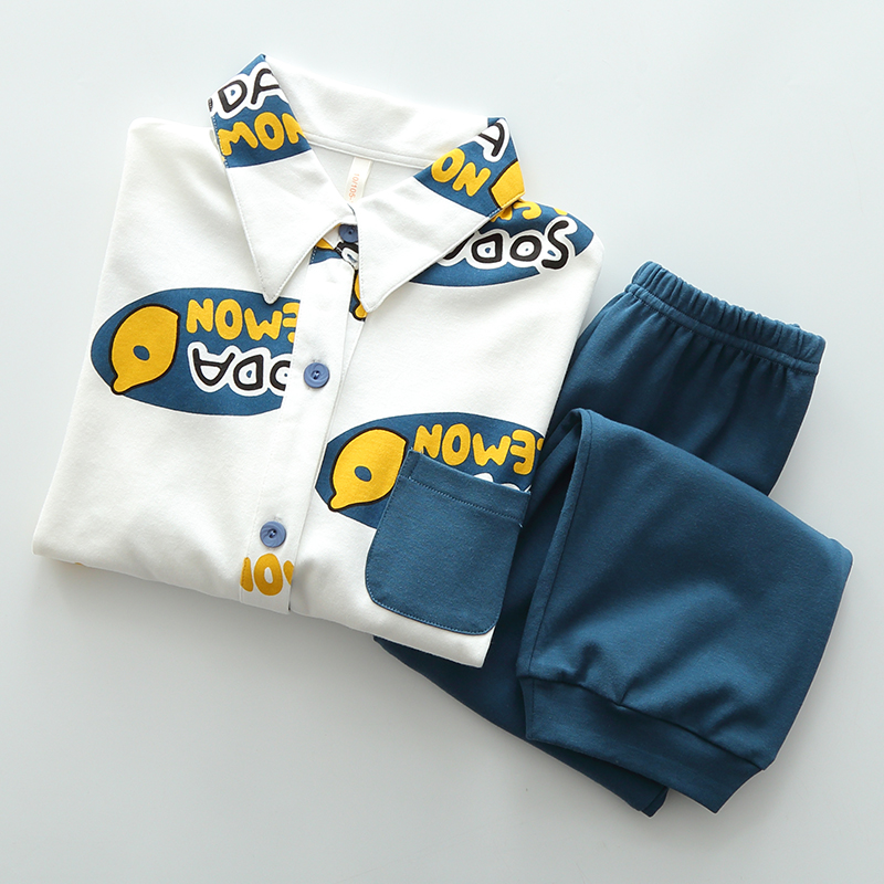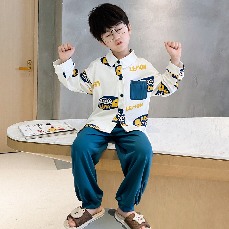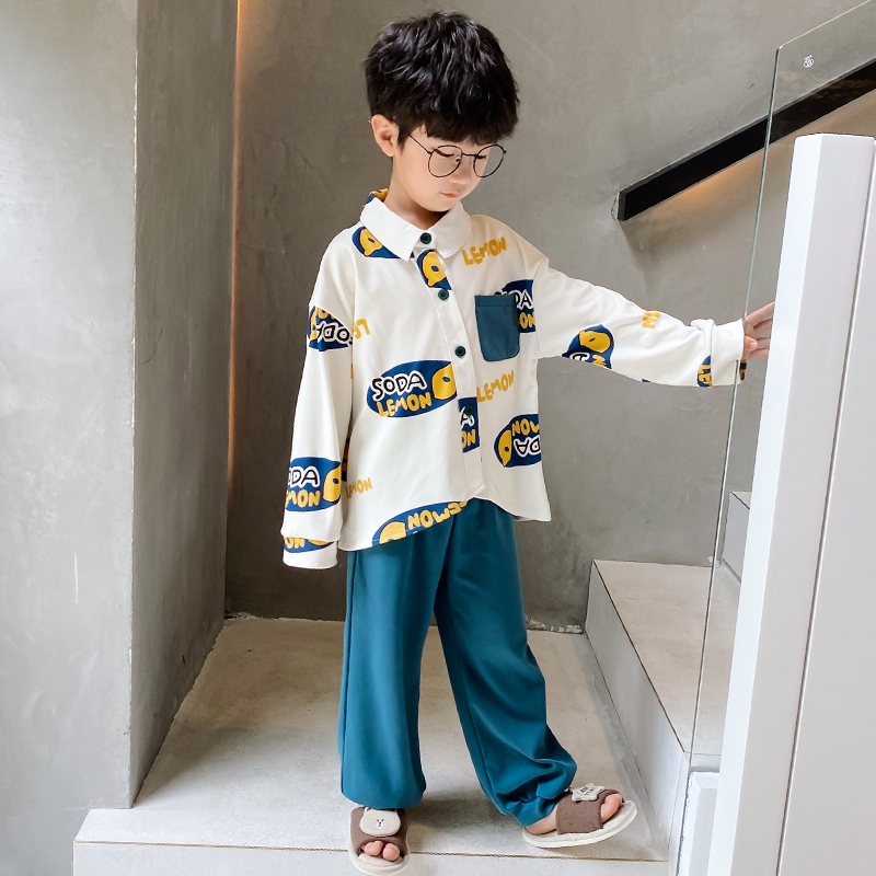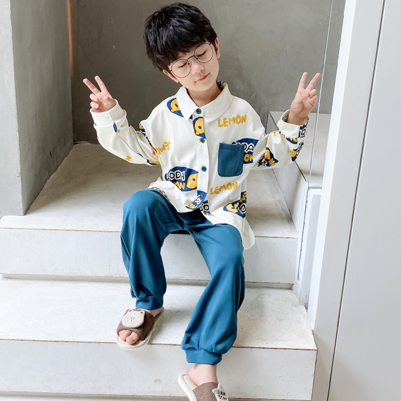 Children's pyjamas boy pure cotton spring and autumn long sleeve suit fashion small turning collar male baby boy's cardio-hoodie home clothes