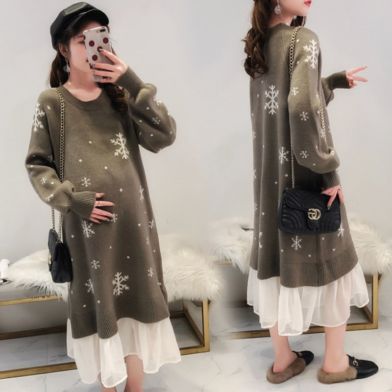 Pregnant Woman Autumn Winter Dress Red Sweater Fashion Foreign Dress Medium Long Version Loose Wool Knit Cardiovert Dress Outskirt Dress Foreign Pie