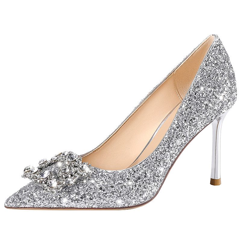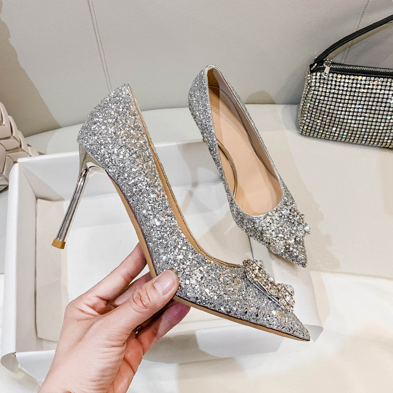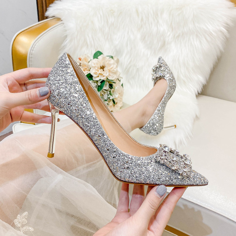 Wedding shoes 2020 new bridesmaid shoes women's bridal shoes square buckle crystal shoes pointed toe stiletto shoes silver high heels