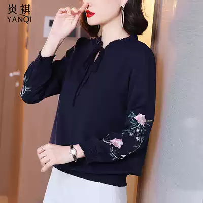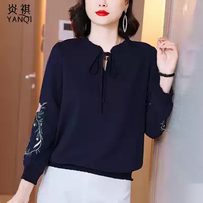 2021 autumn new lace-up embroidered chiffon shirt women's loose Korean feminine top Western style small shirt bottoming shirt