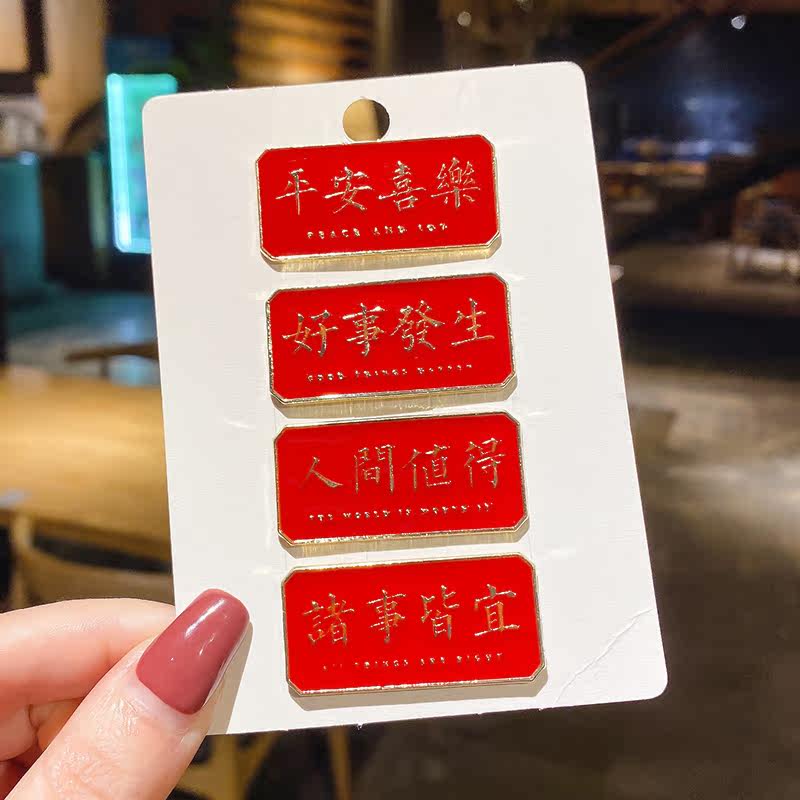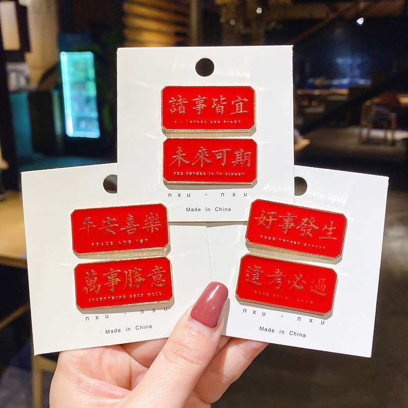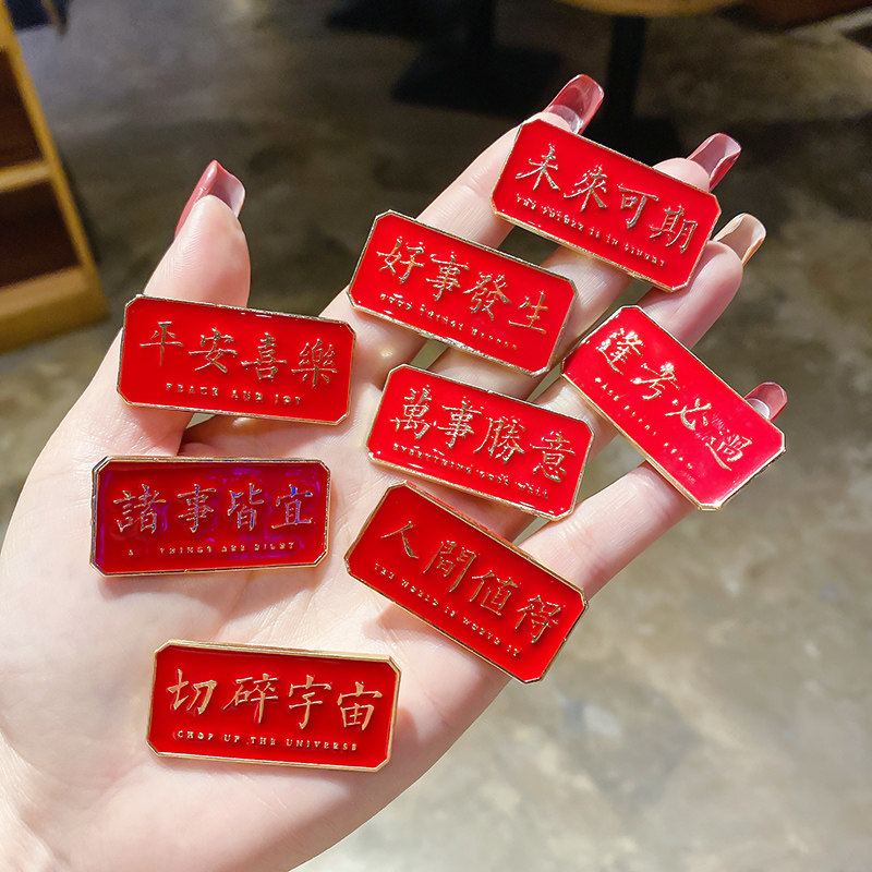 Text red metal brooch New Year's festive birth year Chinese style personality jewelry clothes pin badge accessories