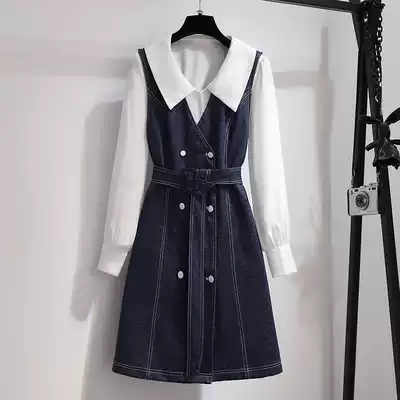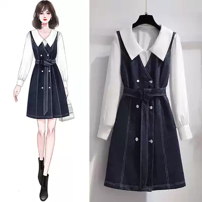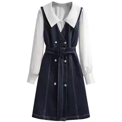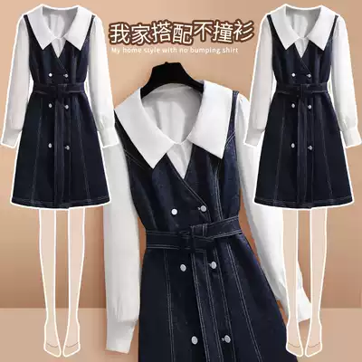 Denim dress autumn 2021 new female waist design sense niche early autumn doll collar skirt two-piece set