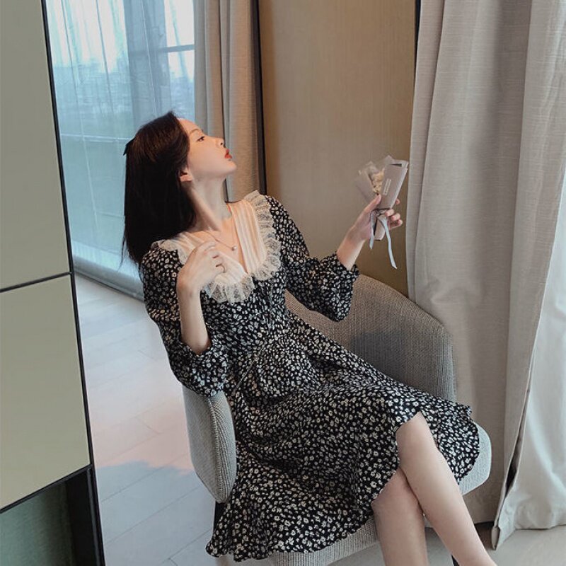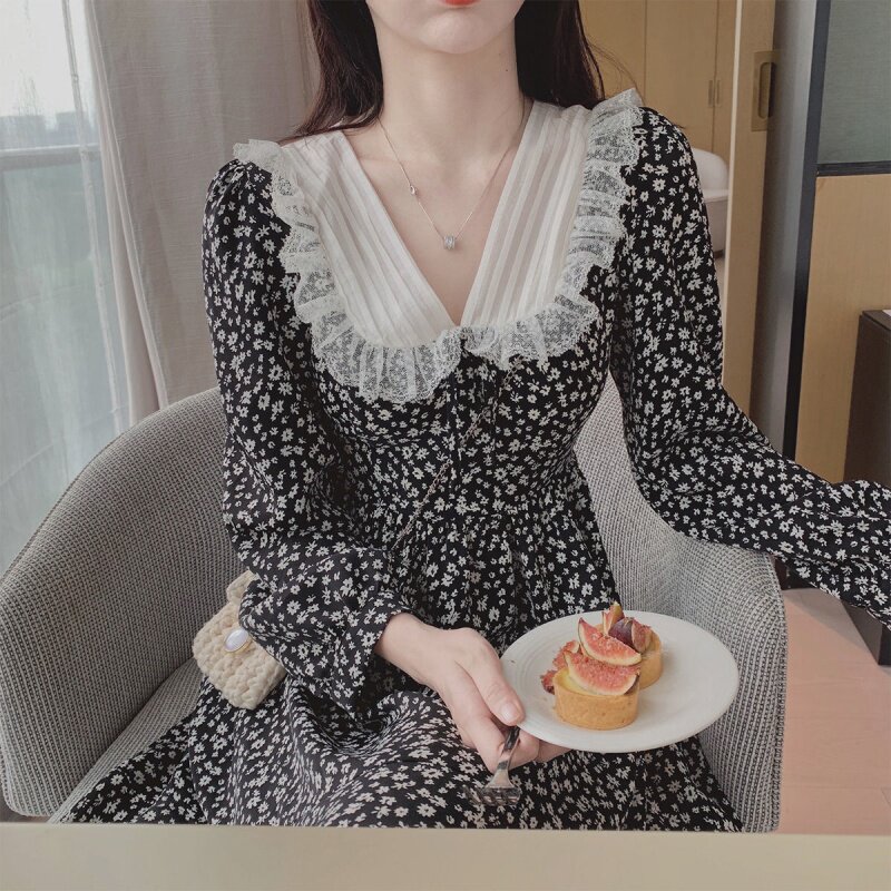 2020 autumn black small floral feminine long-sleeved dress waist thin temperament Lace collar skirt