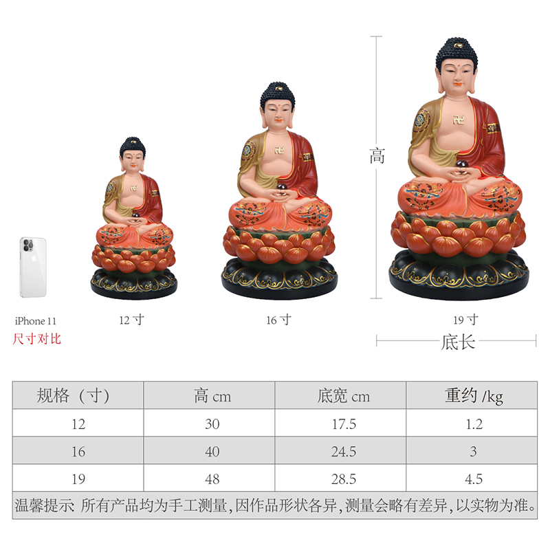 16-inch Amitabha (high 40 cm) 19-inch Amitabha (high 48 cm) 12-inch Pharmacist Buddha (High 30 cm) 16-inch Pharmacist Buddha (High 40 cm) 19