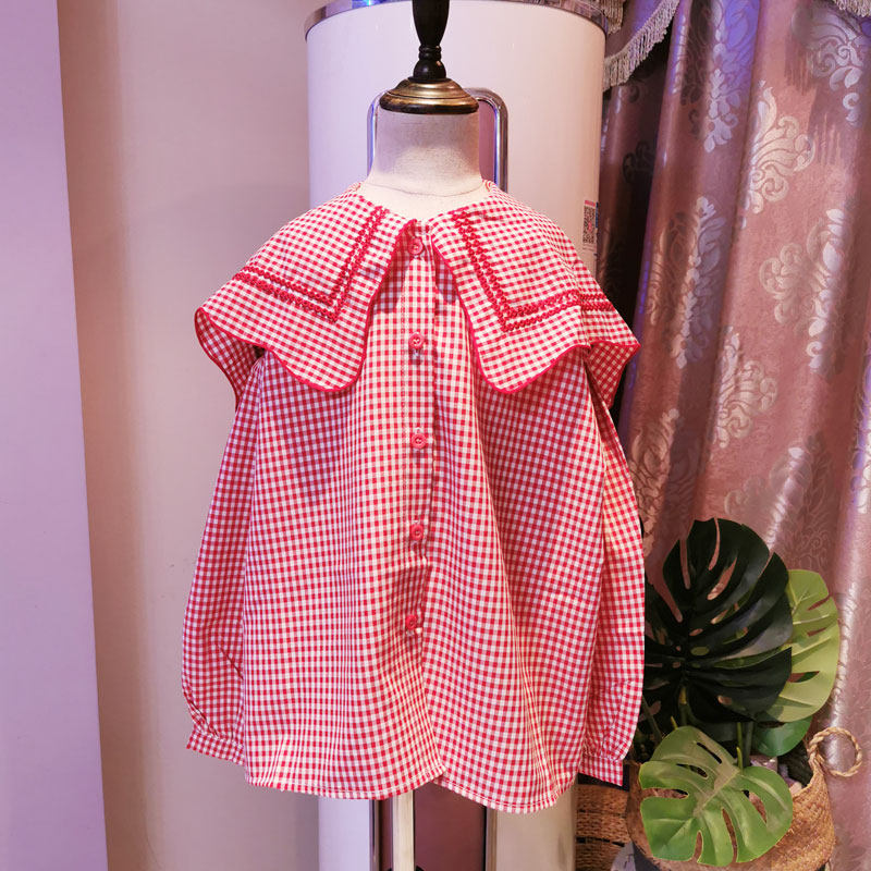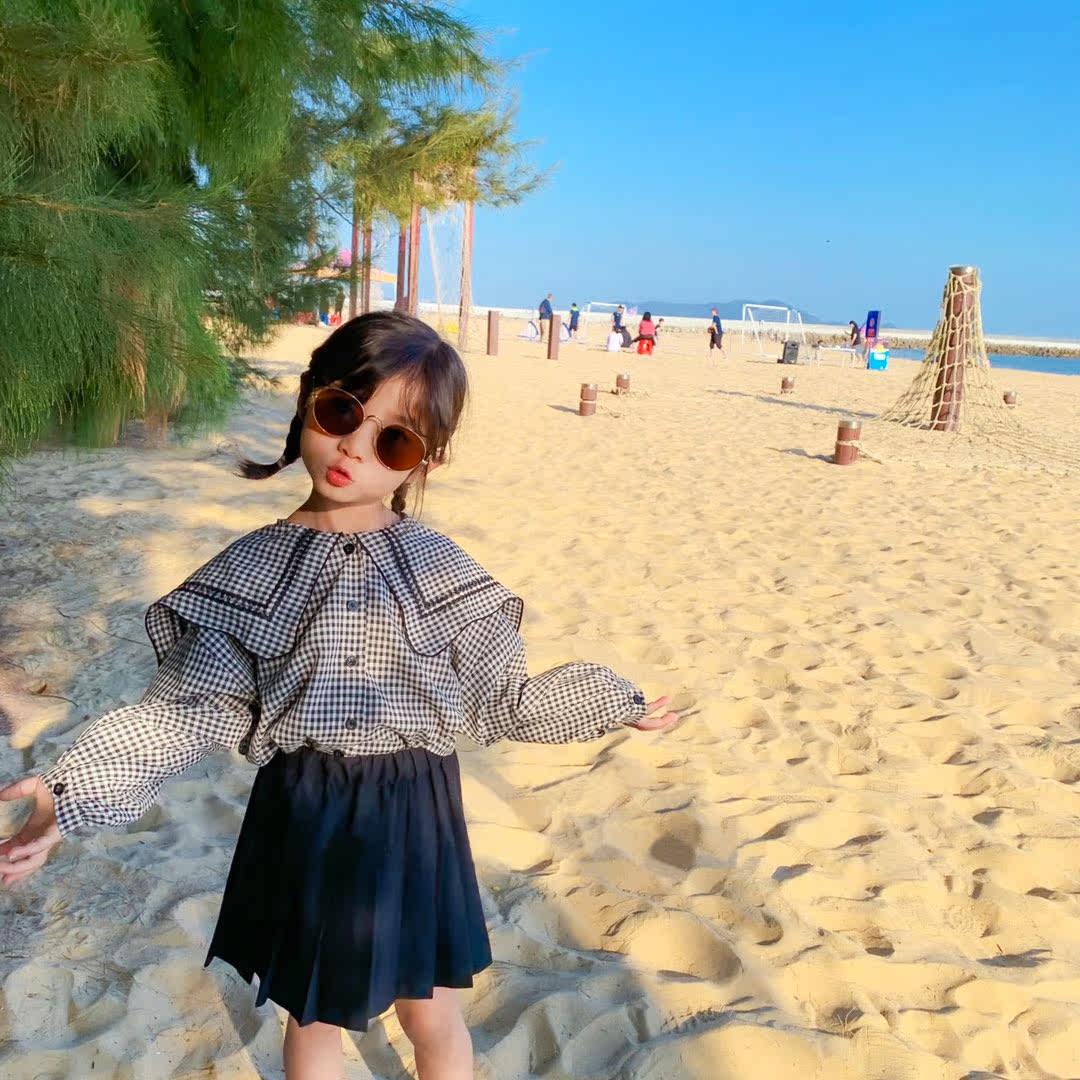 Children's clothing 2022 new autumn shirt girls Korean version short plaid shirt children's foreign style navy collar clothes
