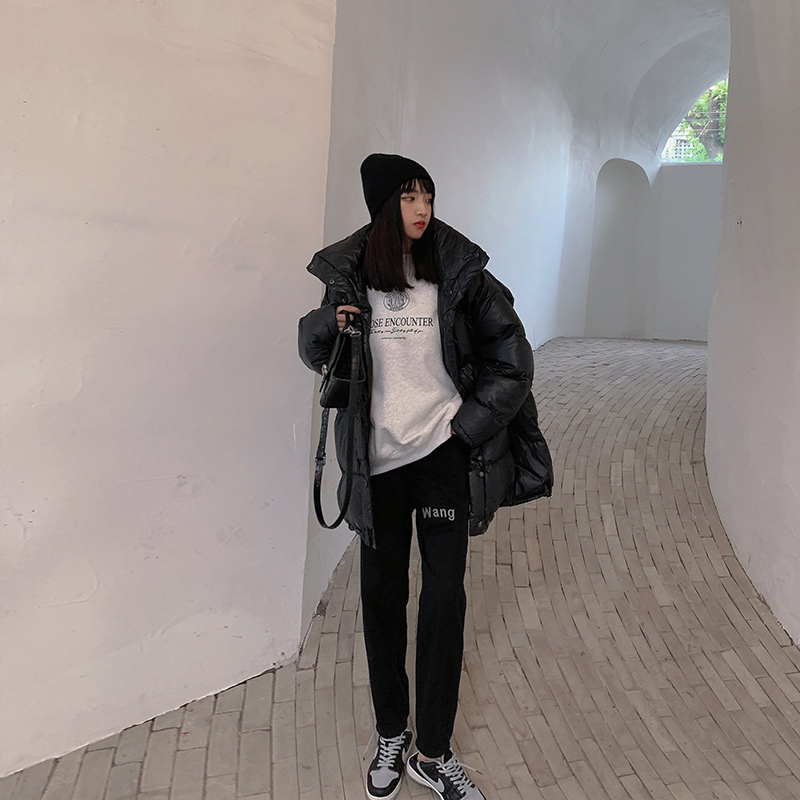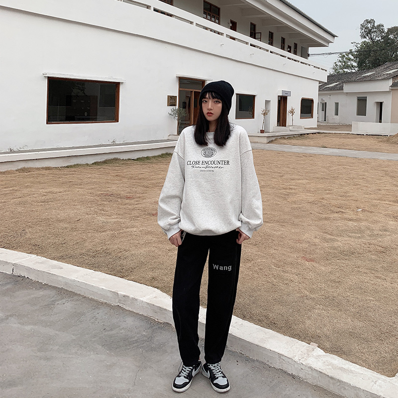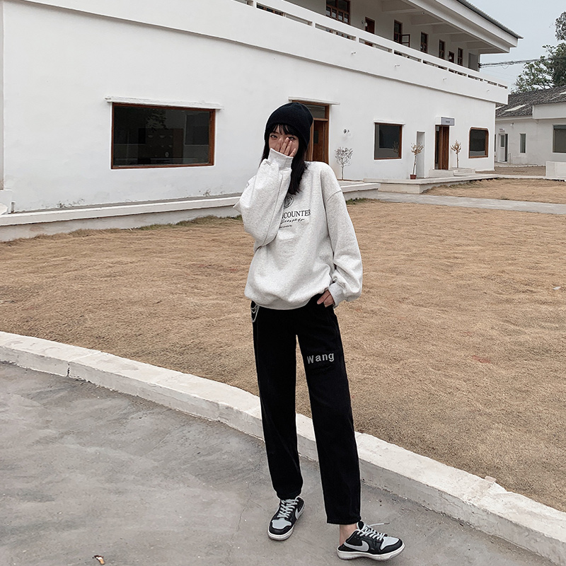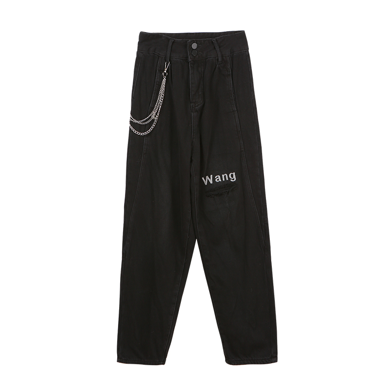 Black jeans women's high waist thick hanging chain letter printing straight leg loose trousers trendy