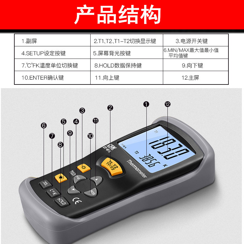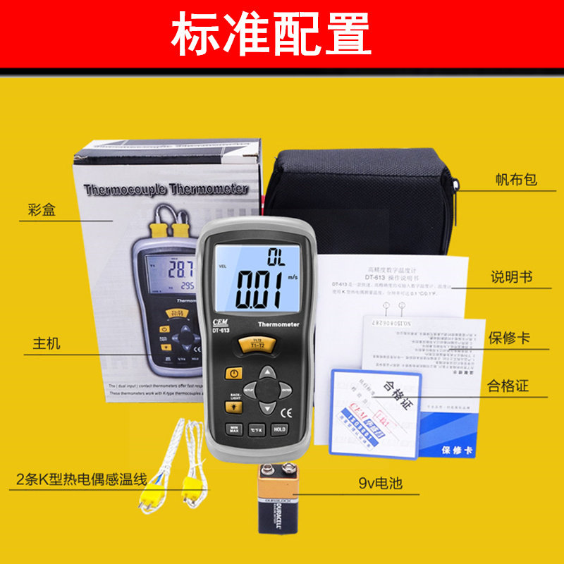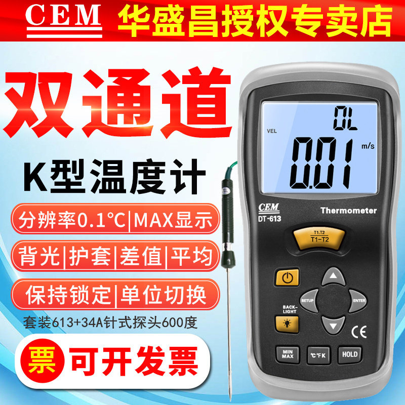 CEM industrial high-precision dual-channel thermometer DT613 contact K-type temperature probe electronic thermometer