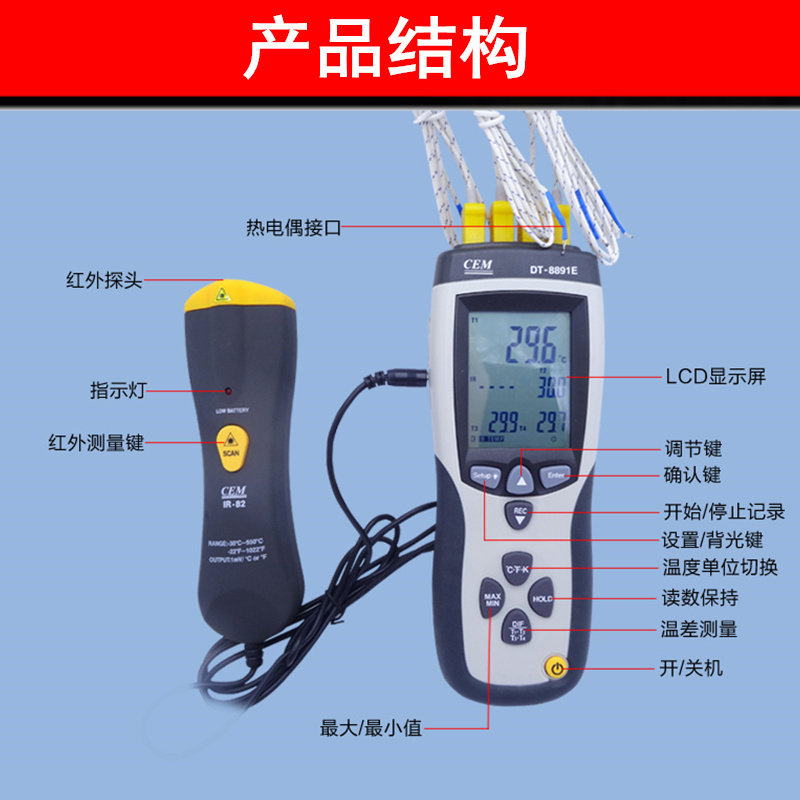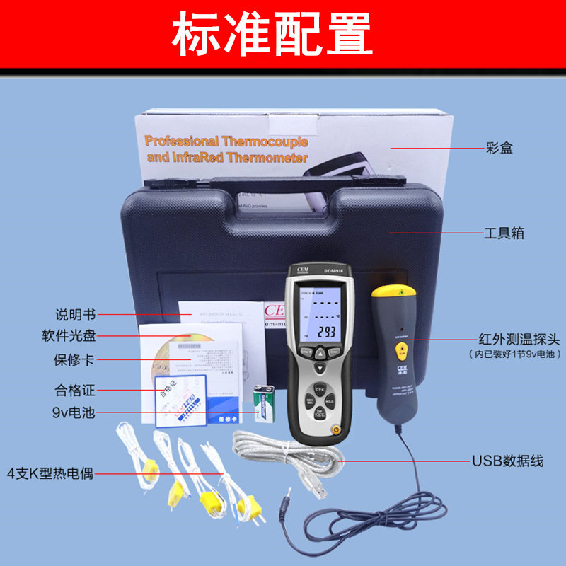 DT-8891E standard configuration (with 4 1-meter-long temperature-sensing wires -50~200 degrees) DT-8891E standard configuration (with 4 1-meter-long temperature-sensing wires -50~200 degrees